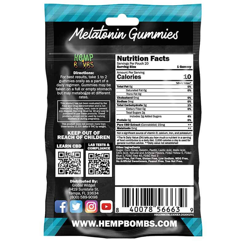 Hemp Bombs® 20-Count CBD Sleep Gummies are tasty chews infused with 15mg of premium CBD and 5mg of the sleep aid melatonin to encourage more restful sleep. These CBD Gummies for Sleep feature delicious flavors, including Strawberry, Green Apple, Berry, Lime and Blue Raspberry. Sourced from Industrial Hemp plants, our CBD encourages calmness and relaxation amid the hectic nature of everyday life. Taken before bed, our CBD Sleep Gummies may support adequate sleep, helping you wake up well-rested and recharged. Getting enough rest each night makes you feel healthier and happier in your daily life, and our CBD Gummies with melatonin may be able to help you achieve that goal. Click here for more information: What do CBD Gummies do?