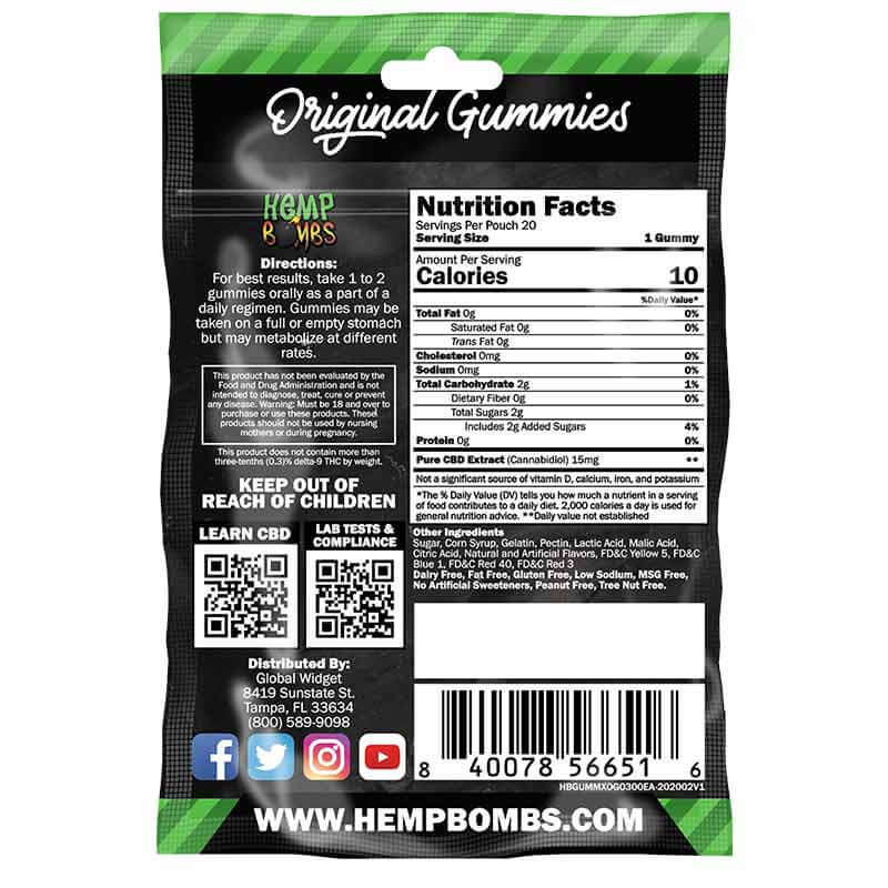 Hemp Bombs® 20-Count CBD Gummies are tasty chews infused with 15mg of premium CBD. These CBD Gummies feature delicious flavors, including Strawberry, Green Apple, Berry, Lime and Blue Raspberry. Sourced from Industrial Hemp plants, our CBD encourages calmness and relaxation amid the hectic nature of everyday life. Taken once or twice daily, Original CBD Gummies may help provide balance and optimize your overall well-being to help you feel your best. Click here for more information: What do CBD Gummies do?