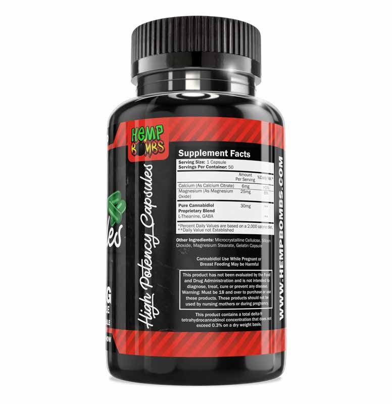 Hemp Bombs High Potency CBD Capsules are flavorless pills that you can easily swallow to obtain a hearty serving of CBD. Each high potency cap holds 30mg of premium CBD and other beneficial ingredients such as calcium, magnesium, GABA and L-Theanine.