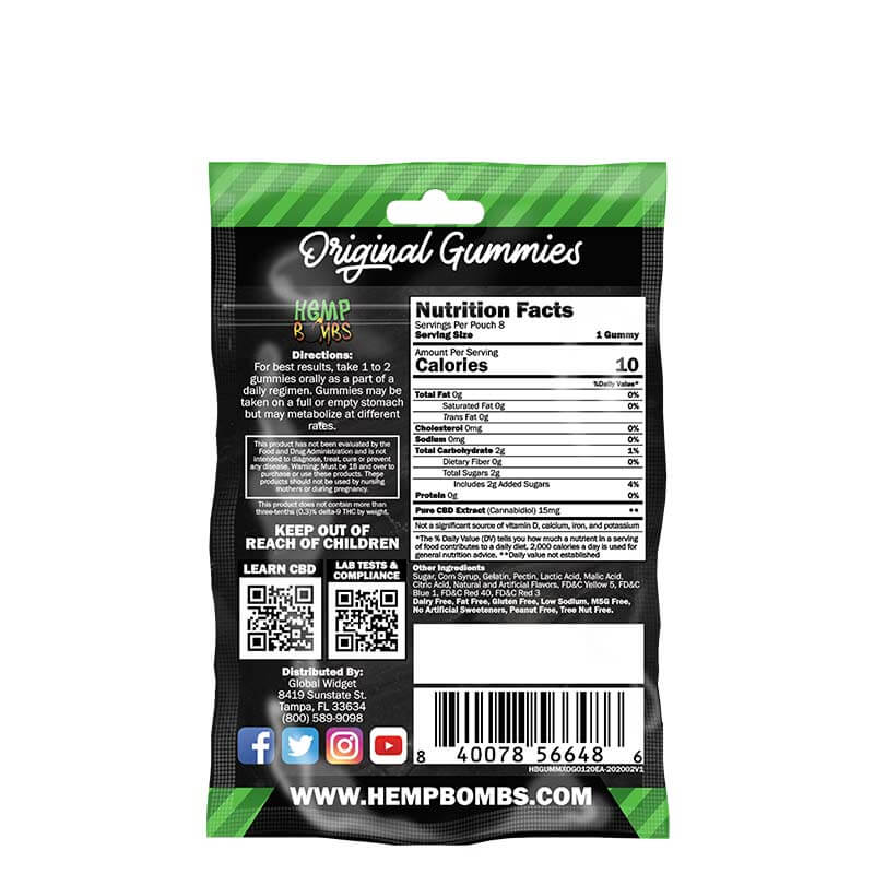 Hemp Bombs® 8-Count CBD Gummies are tasty chews infused with 15mg of premium CBD. These CBD Gummies feature many delicious flavors, including Strawberry, Green Apple, Berry, Lime and Blue Raspberry. Sourced from Industrial Hemp plants, our CBD encourages calmness and relaxation amid the hectic nature of everyday life. Taken once or twice daily, Original CBD Gummies may help provide balance and optimize your overall well-being to help you feel your best. Click here for more information: What do CBD Gummies do?