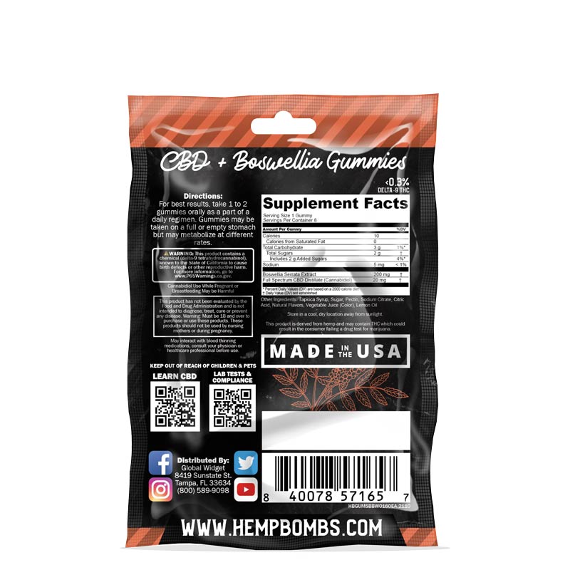 Hemp Bombs 8-Count Full Spectrum CBD Gummies are vegan, bite-sized edibles that contain the relaxing properties of CBD and the anti-inflammatory benefits of Boswellia extract, plus CBC, trace amounts of Delta 9, and other terpenes. Each gummy is formulated with a precise premeasured serving of CBD and Boswellia extract to help you feel your best and ease inflammation.