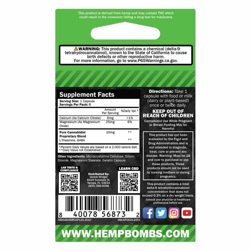 Hemp Bombs CBD Capsules 8-count come prefilled with 15mg of premium CBD and the essential minerals calcium and magnesium. Our capsules also contain L-Theanine – an amino acid that encourages relaxation and helps you feel at ease – and GABA – an amino acid that limits stress and may improve sleep.